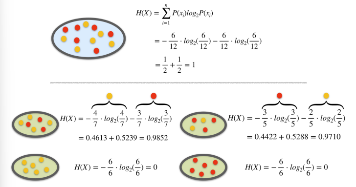 \[ \begin{aligned} & IG(t, s)=\text { (original entr.) }-(\text { entr. after split) } \\ & IG(t, s)=H(t)-\sum_{i=1}^{n} \frac{\left|t_{i}\right|}{t} H\left(x_{i}\right) \end{aligned} \]