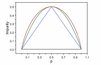 Node impurity functions for the two-class case. The entropy function (rescaled) is the red curve, the Gini index is the green curve, and the resubstitution estimate of the misclassification rate is the blue curve.