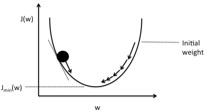 We may suppose \(\theta\in\mathbb{R}^p\), and write the cost function as \(J(\theta)\) to emphasize its dependence on the parameters, that is: \[ \begin{eqnarray*} J: \mathbb{R}^p & \rightarrow \mathbb{R}\\ \theta & \rightarrow J(\theta) \end{eqnarray*} \]