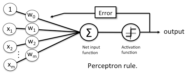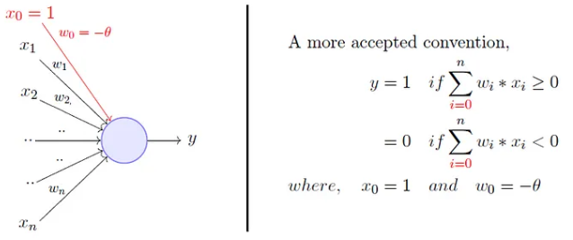 To deal with the bias, we create an extra input variable \(x_{0}\) with value always equal to 1 , and so the function computed by a single artificial neuron (parameterized by its weights \(\mathbf{w}\) ) is: