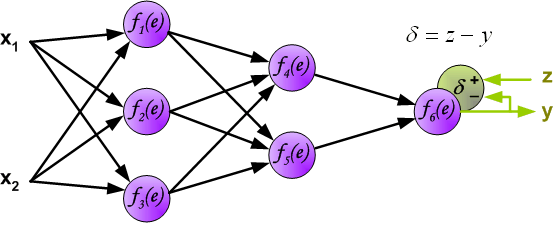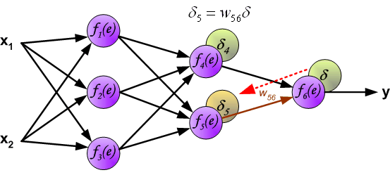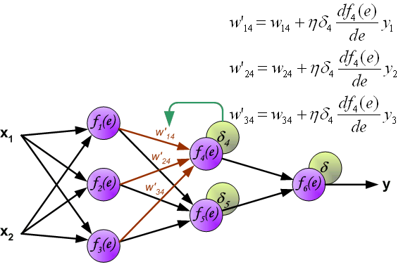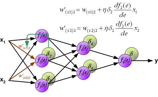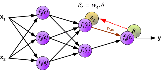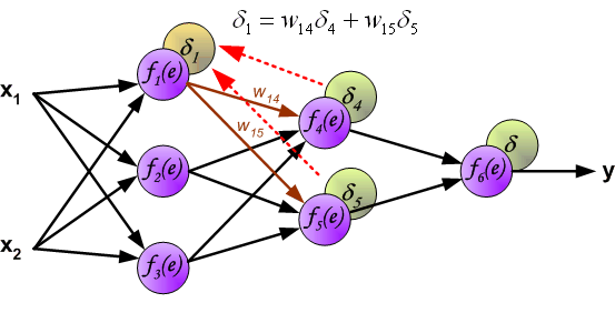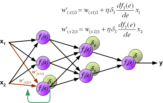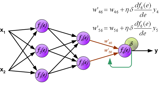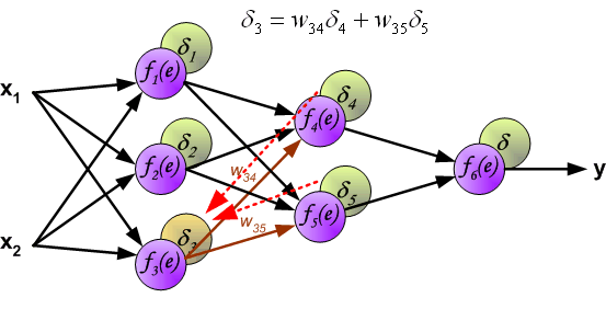 \[ \Delta w_i^j = -\eta \frac{\partial J}{\partial w_{i}^{j}} = \eta \delta_j x_i^j \] where the derivative will be computed applying the chain rule.