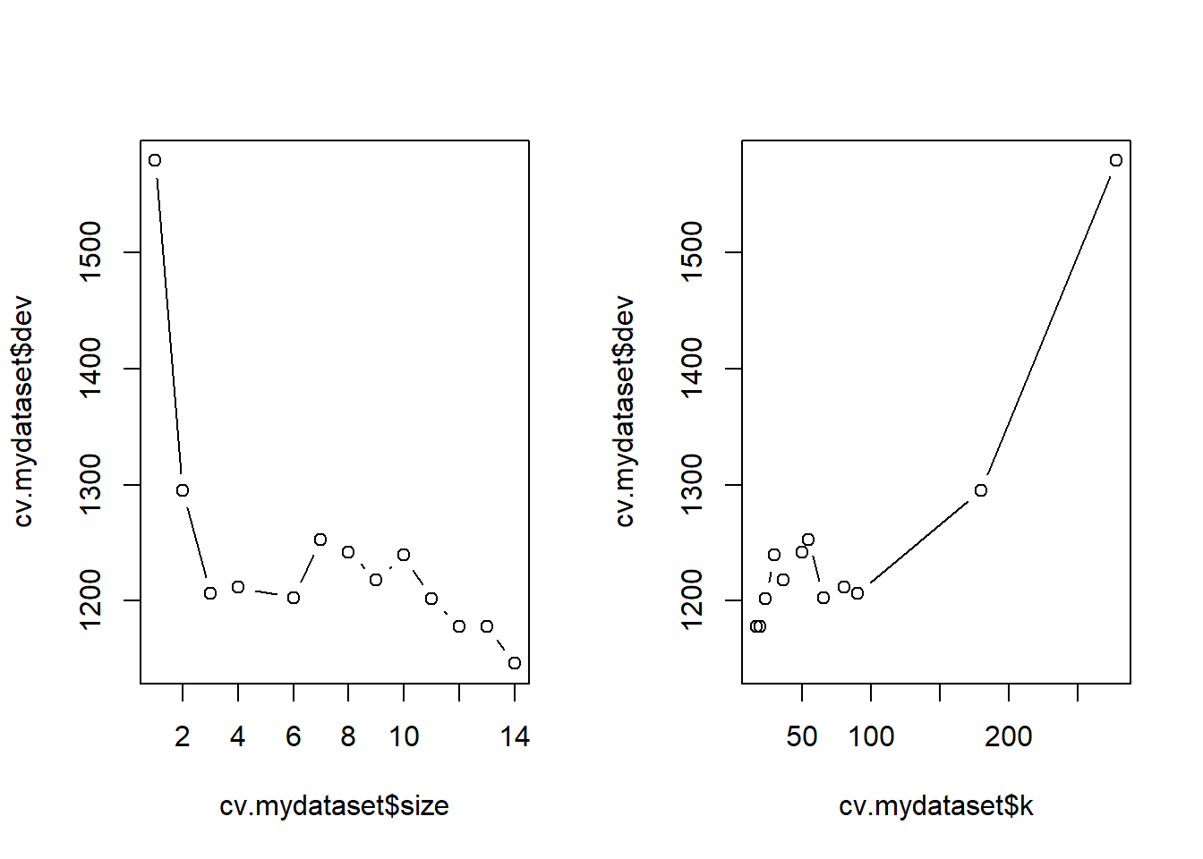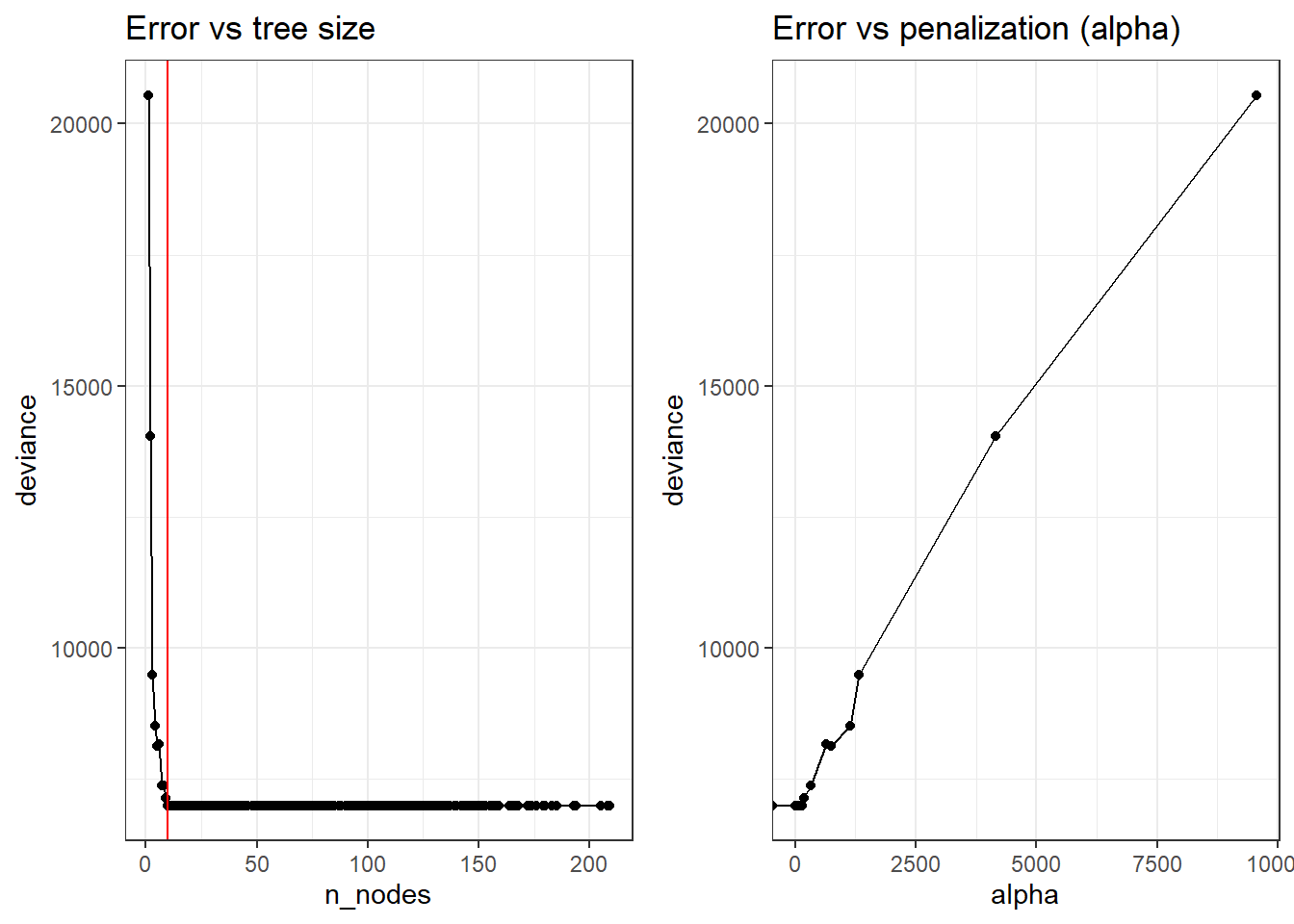 Once the optimal value identified, the final pruning is applied with the prune.tree