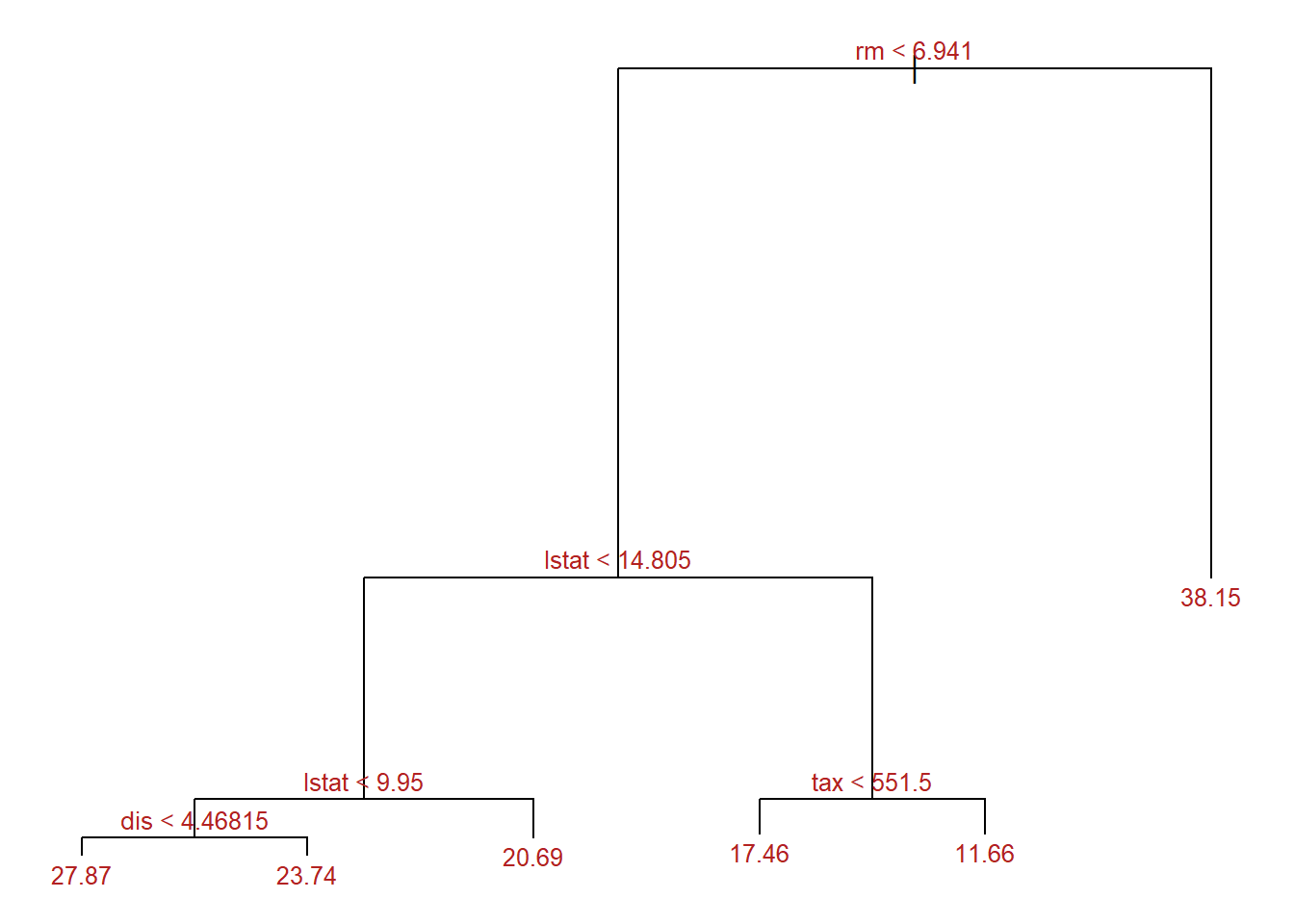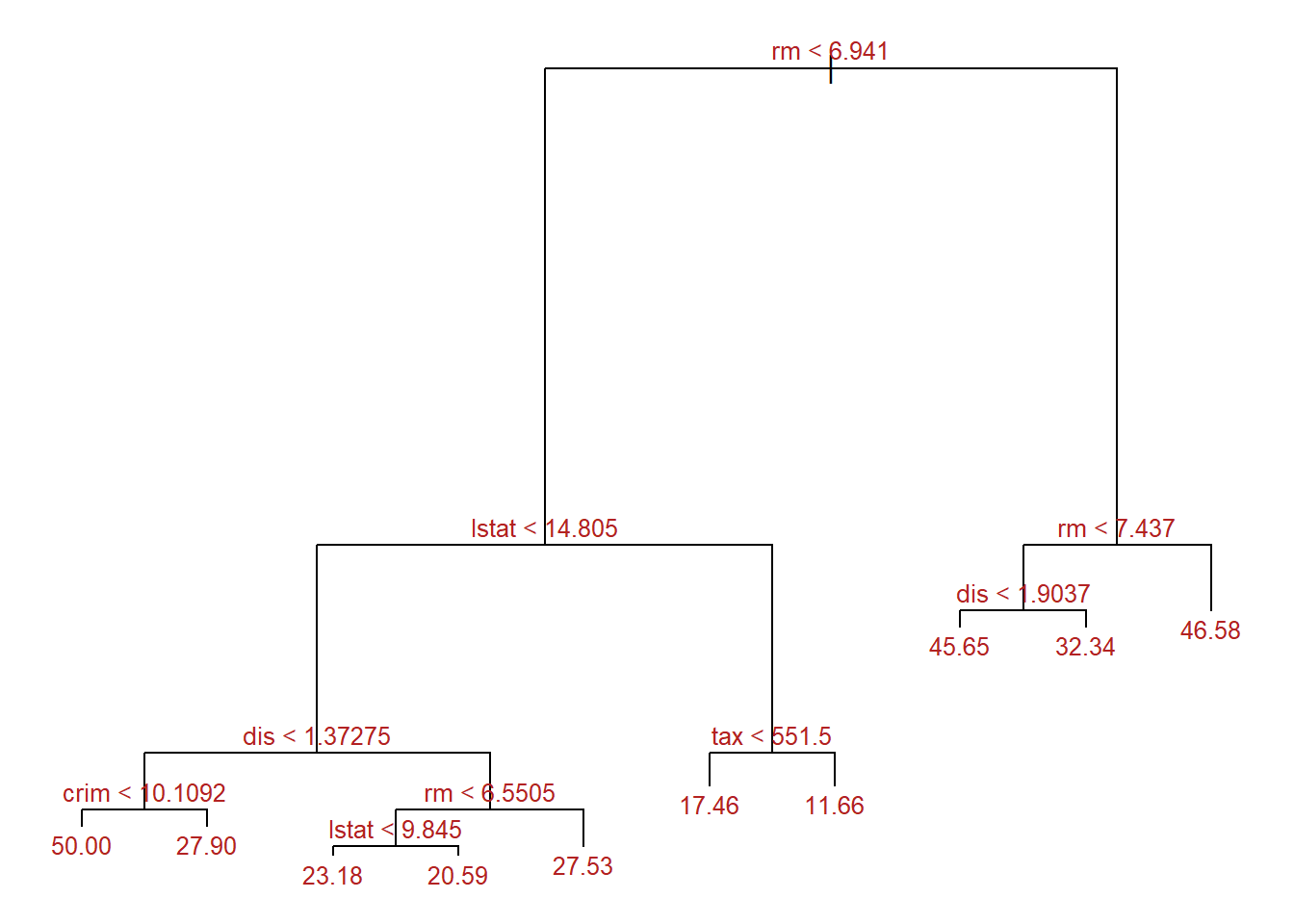 text(x = finalTree, splits = TRUE, pretty = 0, cex = 0.8, col = "firebrick")