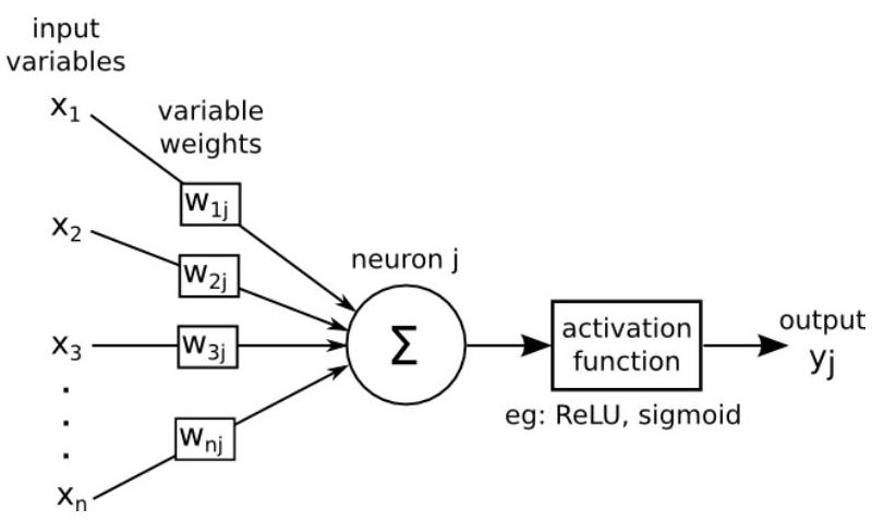 An ANN takes a vector of input values \(x_{1}, \ldots, x_{d}\) and combines it with some weights that are local to the neuron \(\left(w_{0}, w_{1}, . ., w_{d}\right)\) to compute a net input \(w_{0}+\sum_{i=1}^{d} w_{i} \cdot x_{i}\).