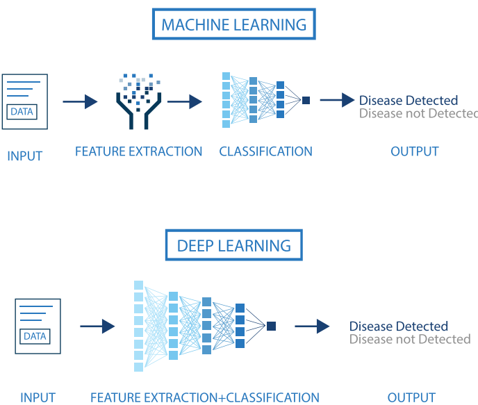 An illustration of the performance comparison between deep learning (DL) and other machine learning (ML) algorithms, where DL modeling from large amounts of data can increase the performance
